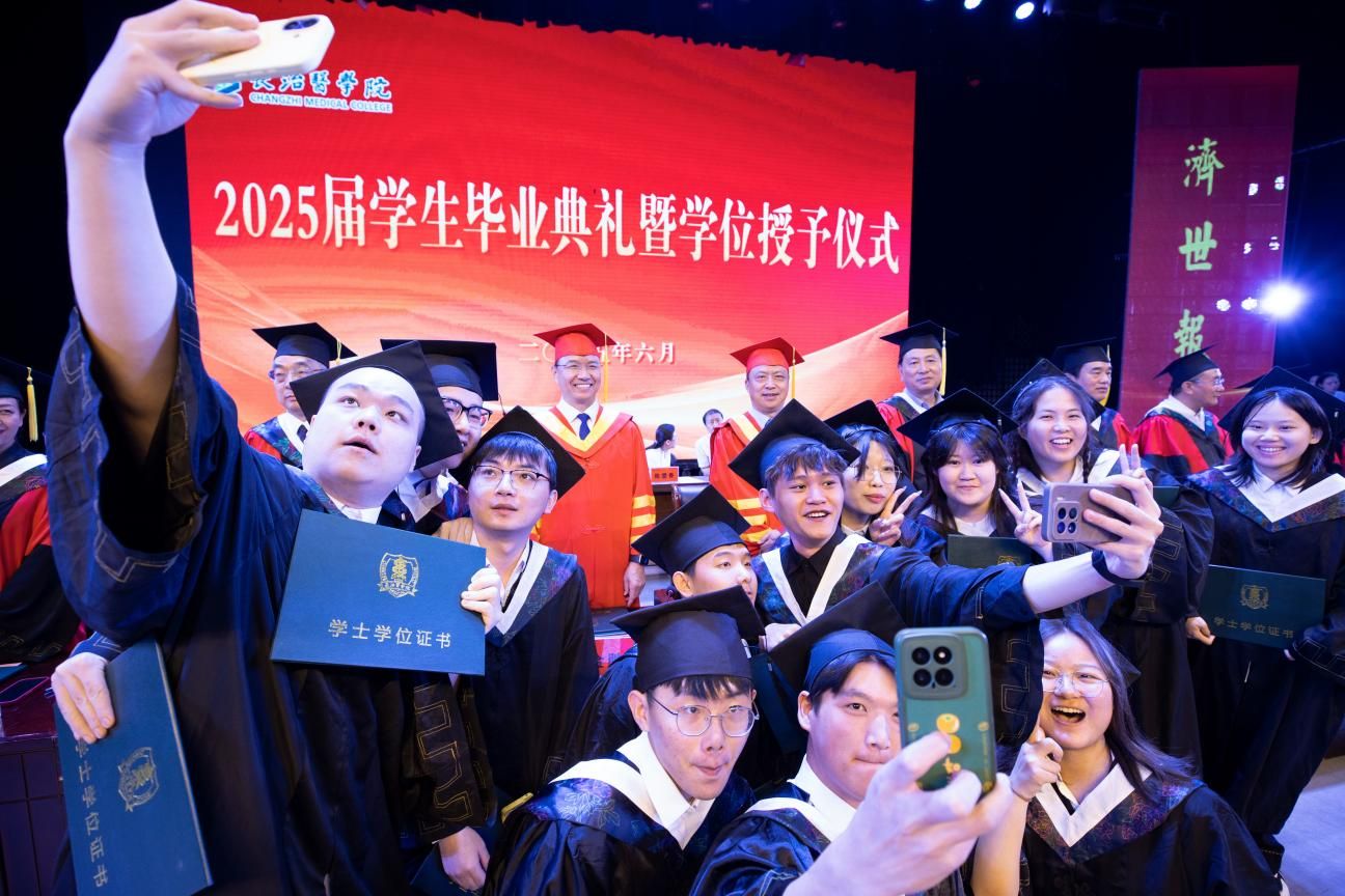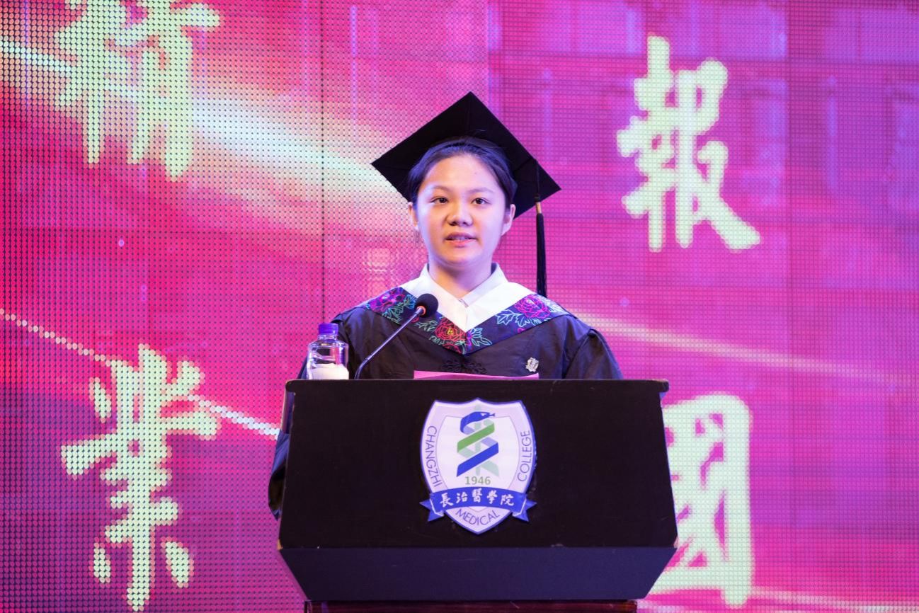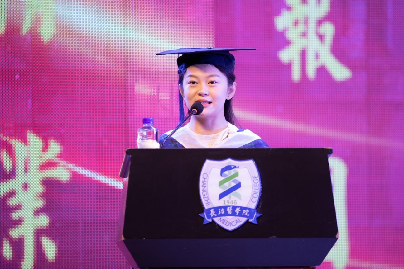 毕业生代表第一临床学院研2201班晋晨雪、公共卫生学院2004班张冀叶分别发言,向母校与师长致以诚挚感恩,表示将铭记师长的谆谆教诲,坚守忠诚担当的政治品格和严谨务实的工作作风,在祖国和人民最需要的地方践行医者使命,为中国式现代化建设贡献长医学子的青春力量