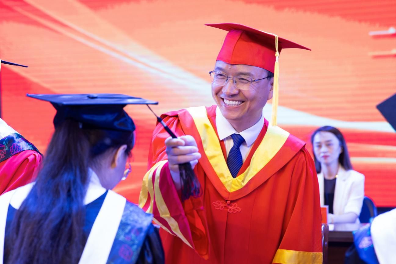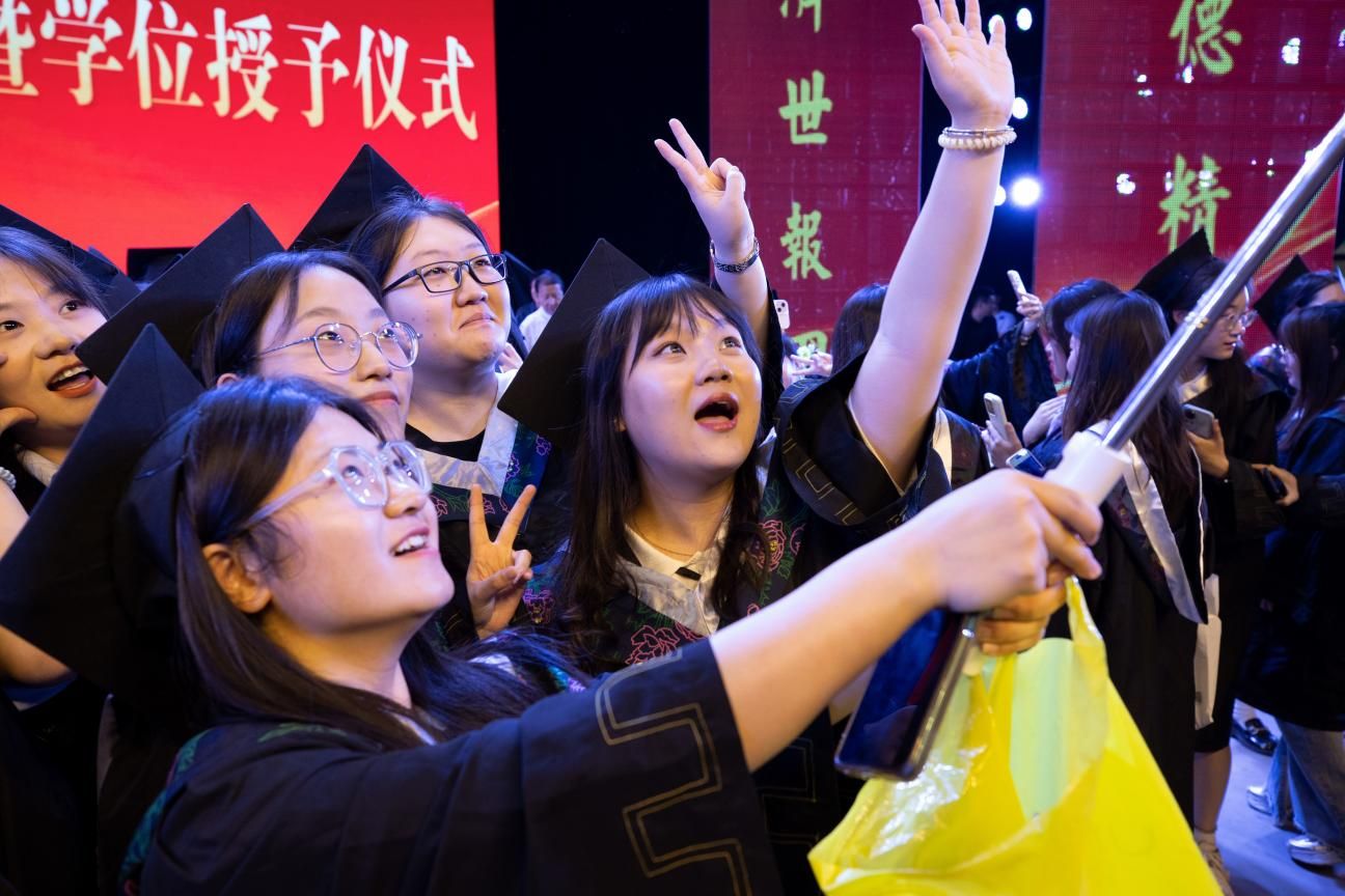 校领导及前排就座的校学位评定委员会委员为毕业生拨穗正冠,颁发学位证书。