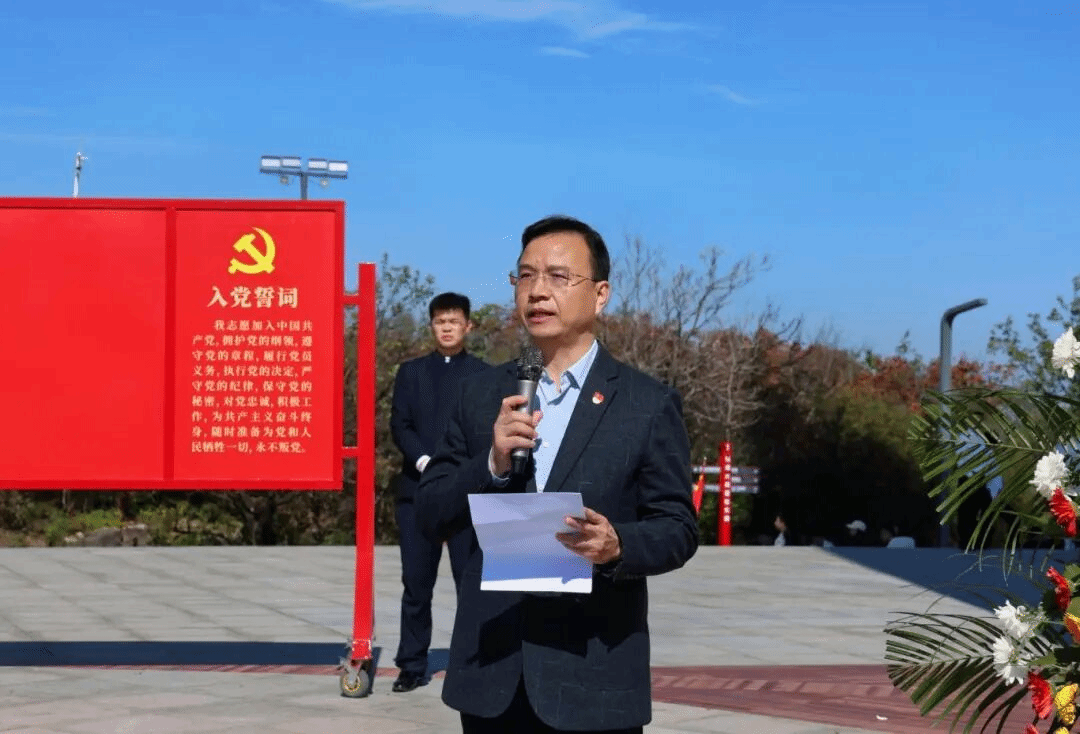 随后,全体党员面向党旗重温入党誓词,党委副书记郑金平领誓,铿锵誓言回荡在狮脑山巅。
