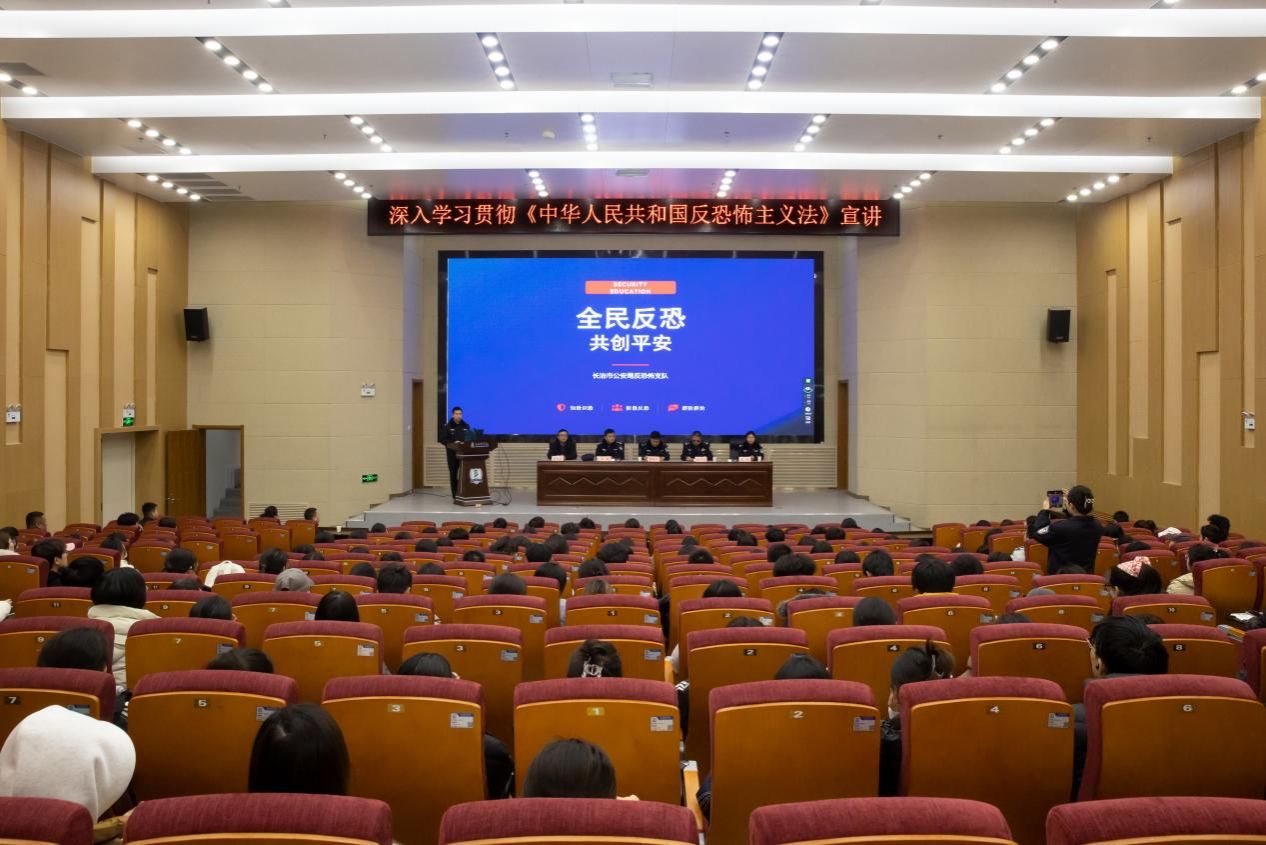 为进一步增强广大师生的反恐防恐意识,提升对恐怖主义威胁的应急处置能力,切实筑牢校园安全防线,近日,学校保卫部、学工部邀请长治市公安局反恐、交警、反诈、网安、禁毒、治安支队等相关部门走进校园,开展《中华人民共和国反恐怖主义法》及校园安全专题宣讲活动。长治市公安局党委委员、二级高级警长暴红卫,反恐怖支队支队长温泉,反恐怖支队政委王瑜,民警秦方震,学校保卫部、学工部相关负责同志及师生代表参加活动。