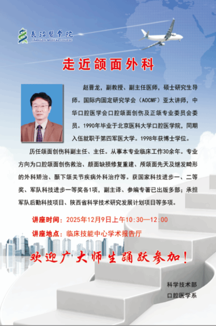 赵晋龙,副教授、副主任医师,硕士研究生导师。国际内固定研究学会(AOCMF)亚太讲师,中华口腔医学会口腔颌面创伤及正颌专业委员会委员。1990年毕业于北京医科大学口腔医学院,同期入伍就职于第四军医大学。1998年获博士学位。历任颌面创伤科副主任、主任。从事本专业临床工作30余年。专业方向为口腔颌面创伤救治、颜面缺损修复重建、颅颌面先天及继发畸形的外科矫治、颞下颌关节疾病外科治疗等。获国家科技进步一、二等奖、军队科技进步一等奖各1项,副主译、参编专著已出版多部;承担军队后勤科技项目、陕西省科学技术研究发展计划项目等多项。