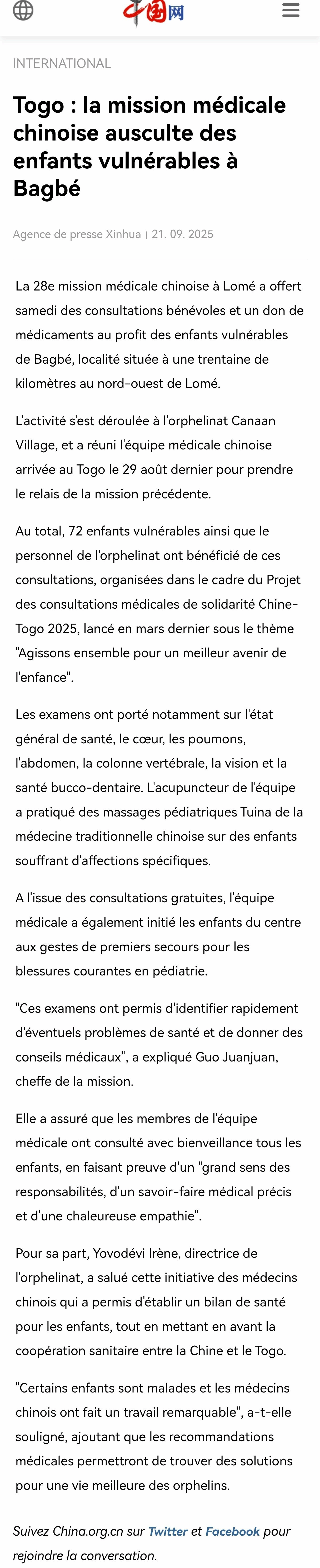 近日,中国(山西)第28批援多哥洛美医疗队在首都洛美Bagabé孤儿院开展的“携手共创儿童美好未来”健康义诊及药物捐赠活动,获多哥通讯社、新华社等中外权威媒体广泛报道,展现了中非友好合作的生动实践,彰显了附属医院援外医疗工作的社会影响力。