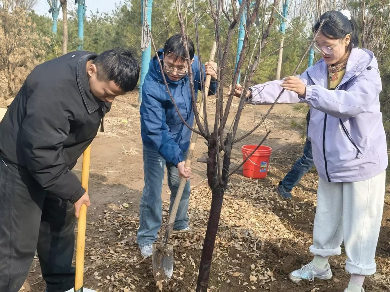 活动现场,党员代表率先垂范,示范植树技巧并全程细致指导,场地负责人同步讲解挖坑、扶苗、填土、压实等关键要领。在党员引领下,师生们迅速分组、分工协作,严格按照操作规范完成每一道工序,还细心在树苗根部预留引水凹槽,一丝不苟的态度彰显着实干担当,田间地头处处涌动着同心植绿的热潮。