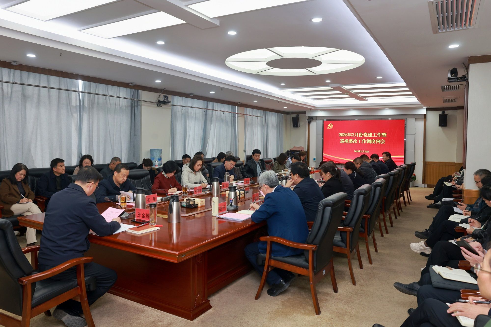 3月19日下午,学校召开党建工作暨巡视整改工作调度例会。校党委书记王金胜主持会议并讲话,党委副书记、校长王旭,党委副书记郑金平,党委常委、副校长来丽娜,党委常委、副校长尚进平出席会议。党委各职能部门、群团组织负责人,各二级党组织书记,科学技术部、基建部、后勤保障部负责人参加会议。